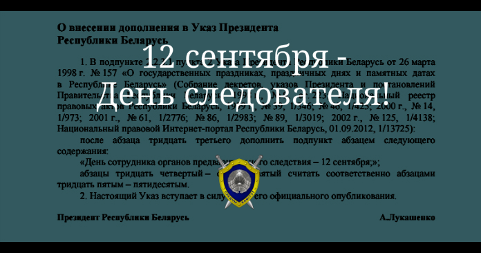 У Беларусі ўводзіцца Дзень супрацоўніка органаў папярэдняга следства, які будзе адзначацца 12 верасня. Аб гэтым гаворыцца ва ўказе №229 ад 21 чэрвеня 2016 года, які апублікаваны сёння на Нацыянальным прававым інтэрнэт-партале.