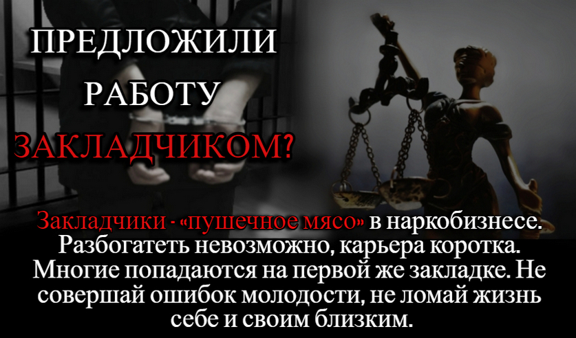 В очередной раз стоит напомнить, что никаких баснословных денег на наркотиках заработать невозможно. Став на путь незаконного наркооборота получаешь билет в один конец. «Карьера» закладчика коротка, а вот количество лет, проведенных в местах лишения свободы в цифровом выражении порой больше, чем количество грамм, которые успел заложить закладчик. Стоит ли оно того?