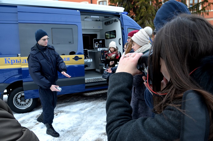 Вначале юноши и девушки познакомились с возможностями передвижной криминалистической лаборатории Следственного комитета. В ходе демонстрации молодые люди расспрашивали представителя соответствующего отдела о периодичности использования данного транспортного средства и о происшествиях, на которое оно осуществляет выбытие.