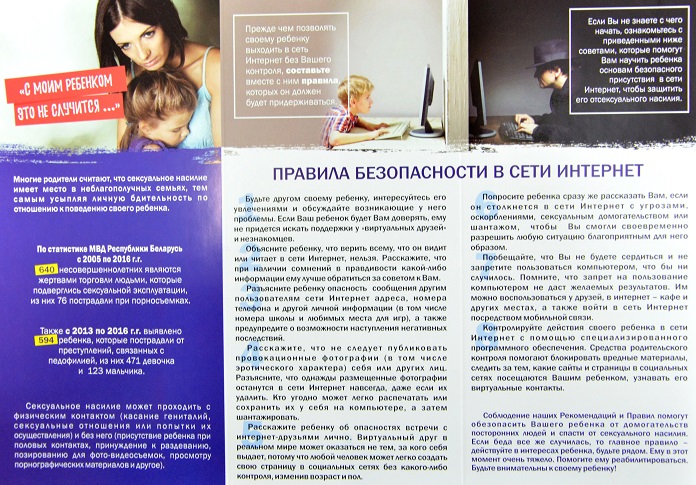В рамках проекта разработаны буклеты с рекомендациями взрослым по обеспечению безопасности детей от сексуальных посягательств, в том числе в сети Интернет, методические рекомендации для следователей территориальных подразделений по вопросам расследования преступлений, связанных с порнографией, а также определяется исчерпывающий комплекс мероприятий и законодательных инициатив, чтобы ребенок смог избежать негативных последствий в эмоциональном плане, вызванных производством уголовного процесса. Кроме того, еще ранее в областных центрах и крупных городах были созданы и действуют специализированные комнаты для проведения специалистами опросов малолетних потерпевших.