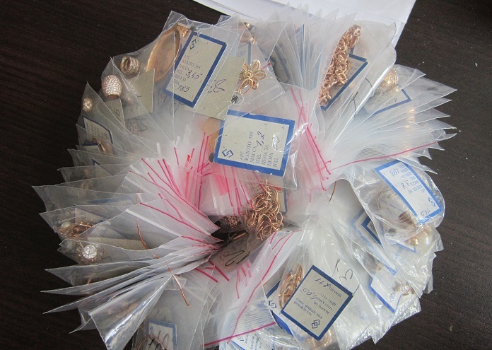 При проведении осмотра дома по месту жительства подследственной были обнаружены 136 золотых ювелирных изделий, общей стоимостью свыше 40 000 деноминированных рублей. Они были упакованы в отдельные полимерные пакеты с этикетками московского завода и вкладышами, содержащими рукописный текст о весе и стоимости изделия. На кухонном столе в тот момент находился листочек с надписью «10$ за кулон», который женщина в присутствии сотрудников органов внутренних дел попыталась уничтожить. Кроме того, в ее блокноте были указаны аналогичные сведения о массе и цене более 30 изъятых украшений. Согласно выводам почерковедческой экспертизы, данные записи были выполнены обвиняемой. Также она не менее 43 раз приобретала билеты на поезда в Российскую Федерацию.