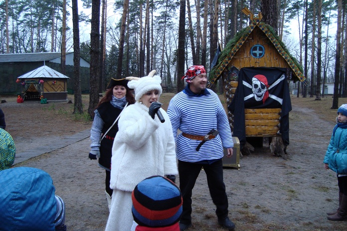 Приехав на место, путешественники окунулись в атмосферу новогоднего праздника. Маленьких посетителей встретили ростовые куклы в виде сказочных персонажей. В «волшебном» лесу не обошлось без происшествия – пираты похитили карту с месторасположением Деда Мороза и Снегурочки.