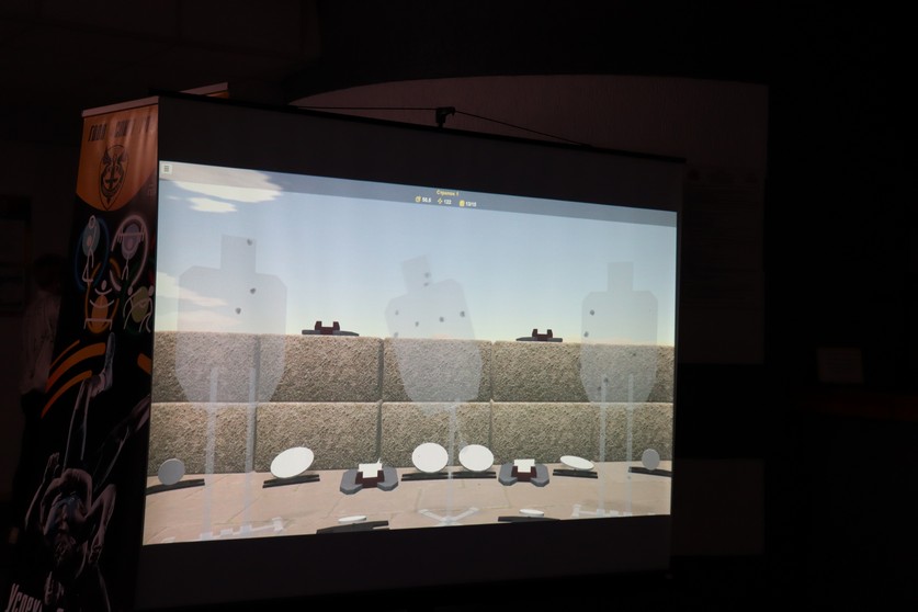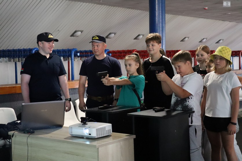 Еще одной точкой притяжения для школьников стала локация с интерактивным лазерным тиром УСК по Гомельской области. Мобильную тренировочную площадку доставили на время из административного здания управления. Подростки с восторгом опробовали стрельбище с различными трехмерными объектами.