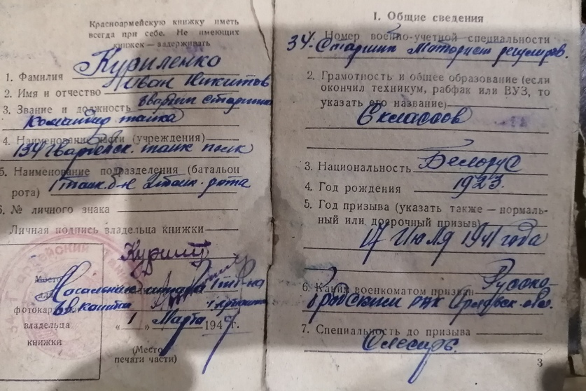 Мой дедушка Куриленко Иван Никитович родился в 1923 году в поселке Ясокорь Буда-Кошелевского района. Был призван в Красную Армию 17 июля 1941 года. Со слов моего отца, дедушка начинал службу сапером. В 1942 году учился в Харьковском гвардейском высшем танковом командном училище. После этого служил механиком-водителем «Т-34» 2-го танкового батальона 186 танковой бригады 10 танкового Днепровского корпуса. С августа 1941 года служил на Центральном фронте, с марта по сентябрь 1943 года на Воронежском фронте, с сентября 1944 года на 2-м и 3-м Прибалтийских фронтах.