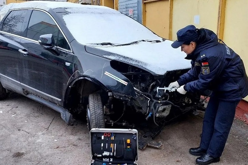 Следователь по особо важным делам первого СО ГГОСК Ирина Лашук фиксирует следы повреждения автомобиля