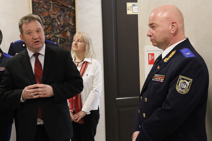 В год 80-летия освобождения Беларуси от немецко-фашистских захватчиков Председатель Следственного комитета Дмитрий Гора ознакомился с экспонатами передвижной выставки картин о трагедии узников Озаричского лагеря смерти, размещенной в здании областного следствия. Работы выполнены студентами кафедры графики механического факультета Белорусского государственного университета транспорта.