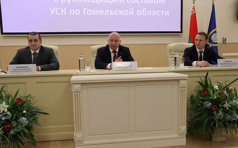 После обсуждения рабочих вопросов глава ведомства исполнил почетную миссию и вручил начальнику УСК по Гомельской области Сергею Удовикову грамоту Государственного секретариата Совета Безопасности Республики Беларусь. Он также поздравил начальника Гомельского РОСК Константина Маслака с присвоением очередного специального звания старшего начальствующего состава «полковник юстиции».