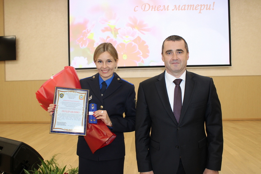 После искреннего теплого поздравления начальник УСК символично вручил матери двоих детей – главному специалисту финансово-экономического отдела Нине Боровик новые погоны «подполковника юстиции».