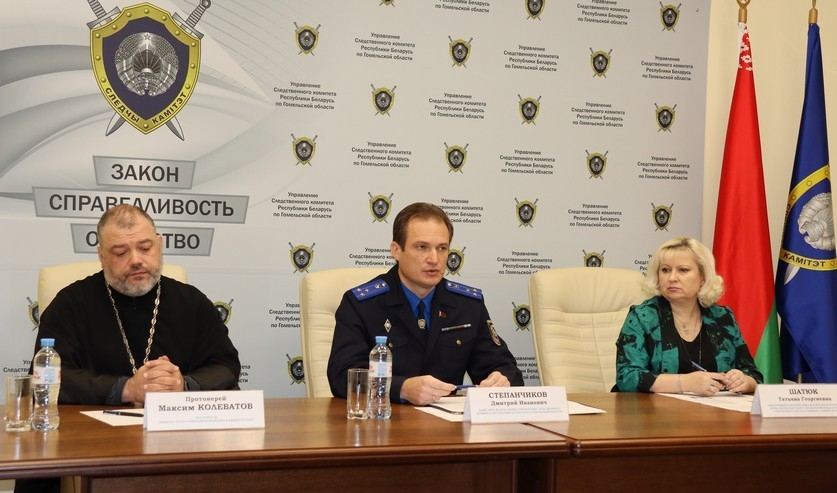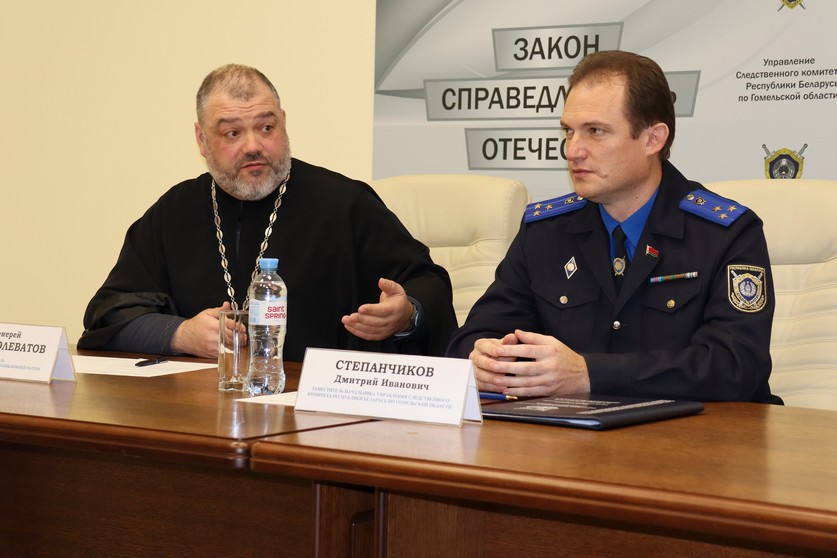 Участниками мероприятия стали заместитель начальника УСК по Гомельской области полковник юстиции Дмитрий Степанчиков, заведующий кафедрой социальной и педагогической психологии факультета психологии и педагогики ГГУ имени Ф.Скорины Татьяна Шатюк. Впервые в подобном формате встречи принял участие священнослужитель – настоятель прихода храма Скитковской иконы Божией Матери протоиерей Максим Колеватов.