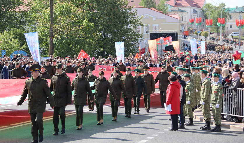Затем состоялся торжественный митинг «Память наша жива, Победа наша священна». Настоящим украшением праздника стал военный парад Гродненского гарнизона «В объективе камеры – парад!».