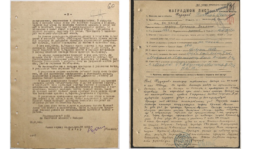 «В момент освобождения Островецкого района партизанской бригадой командовал Николай Иванович Федоров. Известно, что в феврале 1942 года он был направлен в тыл врага для организации партизанского движения. В короткий срок несмотря на тяжелые условия работы, благодаря лишь его организаторскому таланту и личному мужеству и самоотверженности, организовал партизанский отряд в количестве 100 человек. За короткий срок бригадой разгромлено несколько крупных немецких гарнизонов, в том числе гарнизоны: м. Островец, ст. Гудогай, перебито 500 рельс. В открытых боях и засадах убито 128 немцев, захвачено в плен 64 человека и взяты большие трофеи. Николая Ивановича характеризовали как смелого и решительного командира, который предан делу партии Ленина-Сталина и Социалистической Родине. В боях он проявлял стойкость, мужество, самоотверженность и умелое руководство подразделениями», - рассказала Виктория Дмитриевна.