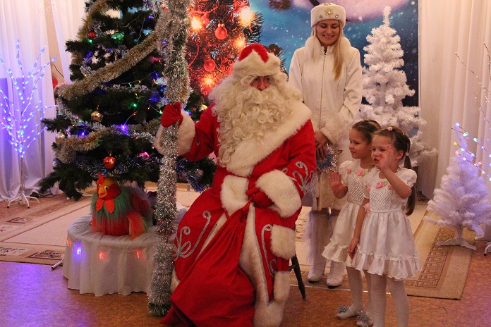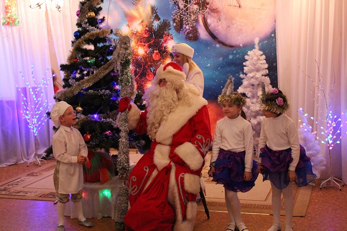 Детишки встретили гостей в карнавальных костюмах. Показали праздничную программу со сказочной постановкой. Деду Морозу мальчики и девочки читали стихи, пели песни.