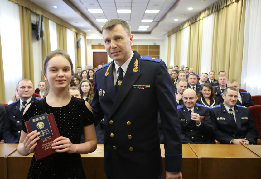 Со вступительным словом выступил заместитель Председателя Следственного комитета Сергей Аземша, который отметил, что ведомство уже третий год подряд принимает участие в Всебелорусской акции «Мы – граждане Беларуси!», в рамках которой юным гражданам из разных уголков нашей страны вручаются паспорта. В этот раз они были вручены детям сотрудников ведомства, достигшим 14-летнего возраста. Также ребята получили в подарок по случаю праздника Конституцию и цветы.