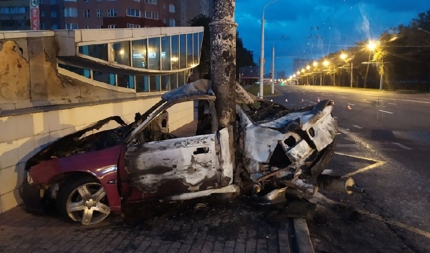 По данным следствия, 16 августа текущего года около часа ночи 25-летний водитель автомобиля Subaru двигался по проспекту Партизанскому в Минске. Проезжая вблизи дома 19А указанного проспекта молодой человек не справился с управлением, выехал за пределы проезжей части и совершил наезд на мачту освещения, в результате чего произошло возгорание транспортного средства.