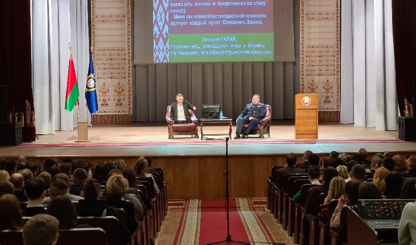 Главной темой для встречи во Дворце культуры ОАО «МТЗ» стал вопрос проведения в стране конституционного референдума. Следователи столицы, члены их семей, внештатные сотрудники, учащиеся юридических вузов столицы, проходящие практику в следственных подразделениях г. Минска, смогли пообщаться с паралимпийцем, рекордсменом мира и Европы по плаванию, общественным деятелем, членом Конституционной комиссии Алексеем Талаем, который рассказал о своей жизни, а также остановился на работе над проектом изменений и дополнений в Основной Закон страны.