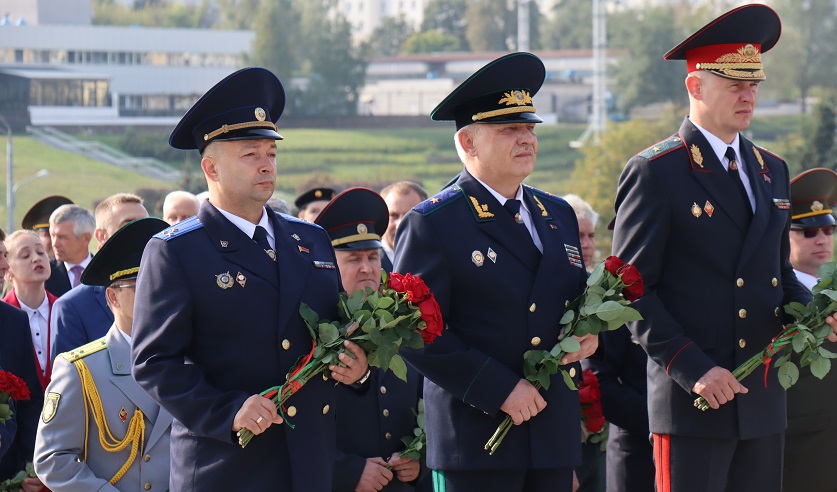 Делегация в составе руководства правоохранительных органов столицы и начальника УСК по городу Минску Евгения Архиреева возложила цветы к стеле, воздав славу героям, победившим гнет немецко-фашистских захватчиков.