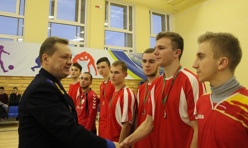 Завершилось посещение УСК по г. Минску в спортивном зале, где проводился рождественский турнир по мини-футболу среди команд юридических факультетов и сборной столичных следователей. Открыл спортивное состязание заместитель начальника УСК по г. Минску Евгений Архиреев.
