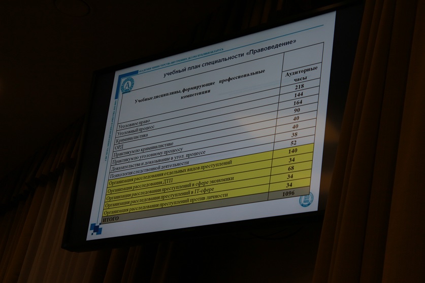 Помощник начальника следственно-экспертного факультета Академии МВД Михаил Клишевич подробнее остановился на учебном процессе и оснащенности учебного заведения, распорядке дня и бытовых условиях. Он осветил планы проведения практик, выступлений представителей ведомства. Основной упор, как отметил приглашенный гость, делается на изучении таких дисциплин, как уголовное право, уголовный процесс и криминалистика.