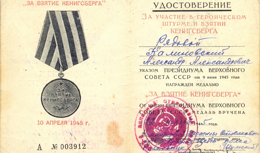Дедушка, Александр Александрович, участвовал в боях в составе II и III Белорусских фронтов в Восточной Пруссии, а победу встретил в составе своего полка по дороге на Берлин в немецком городе Алпенштейне.