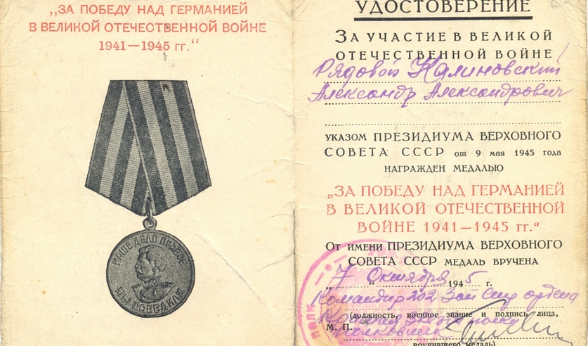 Уже давно нет в живых моего дедушки, Калиновского Александра Александровича, который родился 15 декабря 1917 года в деревне Михановичи Минской области. С 1935 по 1940 годы он работал учителем младших классов в сельской школе, а затем и завучем школы. Указом Президиума Верховного совета СССР за хорошую постановку работы в школе и активное участие в политической и хозяйственной жизни колхоза в 1938 году его наградили медалью «За трудовое отличие», которую вручал лично Председатель Президиума Верховного Совета СССР Калинин М.И. в Георгиевском зале Кремля.