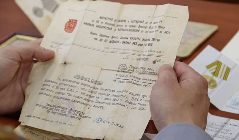 После чего следователь Тимур Гуторев с осторожностью раскрывает пожелтевший листок, это архивная справка по документам партархива Института истории партии при ЦК КП Молдавии, в которой указано, что Цалко Василий Николаевич с 28 мая 1943 года числился на 1 июня 1943 года бойцом партизанского отряда «За освобождение Советской Молдавии», 1-го Молдавского соединения партизанских бригад. Тимур Олегович бережно листает военный билет прадеда, где целая жизнь умещена в совсем коротких строках: «С января 1944 года по 9 мая 1945 года участие в Великой Отечественной войне в составе 131 отдельного корпуса саперного батальона».