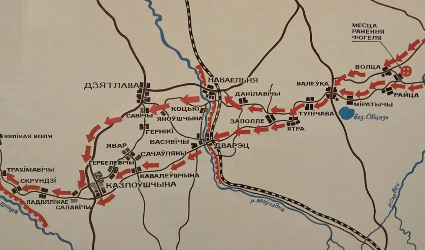 «Днем 5 июля 1944 года 2-ой Белорусский фронт начал Белостокскую наступательную операцию, которая являлась составной частью операции «Багратион». Наступление 3-й армии на Белостокском направлении разворачивалось удачно. Сформированные отряды стрелковых корпусов, дивизий окружали группы противника, захватывали переправы, дорожные узлы и удерживали их к приходу главных сил. С 7 по 10 июля 1944 года шло постепенное освобождение населённых пунктов Дятловского района. Началось оно с рейда в тыл врага 556-го стрелкового полка 169 стрелковой дивизии. Полк вёл бой за освобождение станции Дворец. И 9 июля они овладели станцией. В этих боях полк уничтожил более 200 солдат и офицеров, 3 танка, 40 автомобилей, захватил много оружия и техники противника», - отмечает заместитель начальника райотдела.