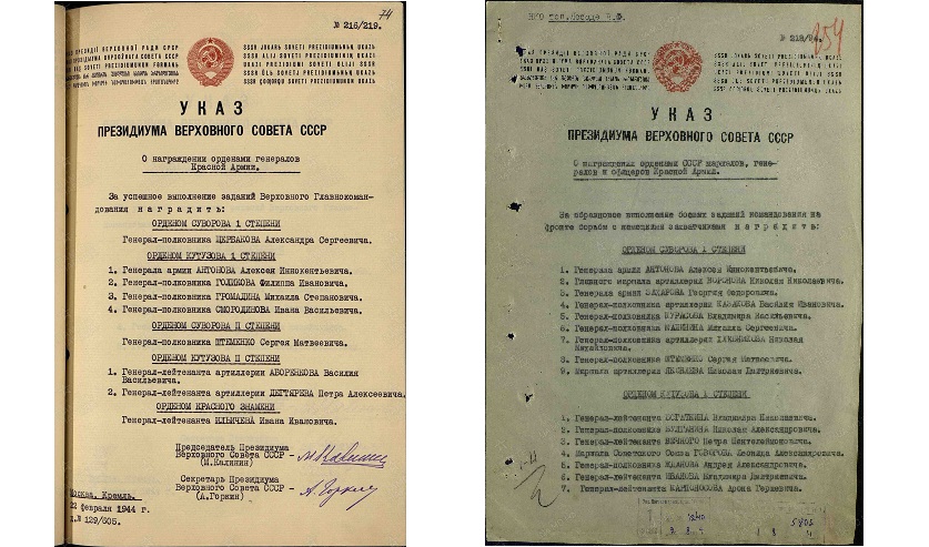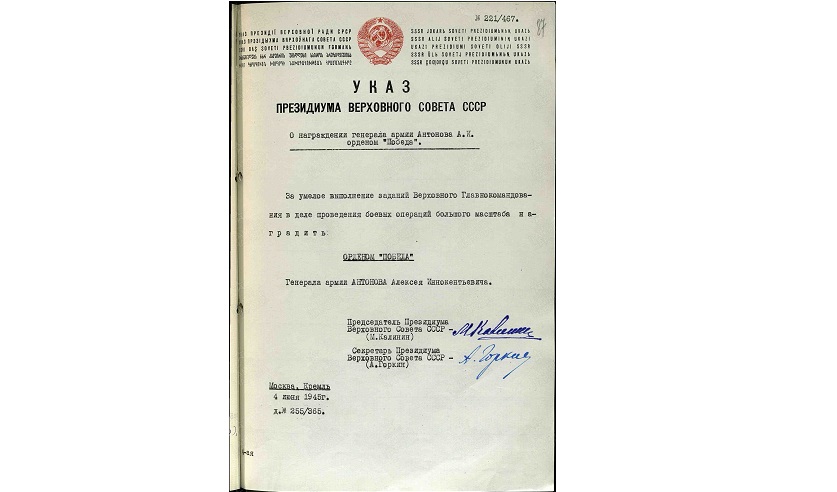 полученный 4 июня 1945 года, за участие в разработке решающих операций