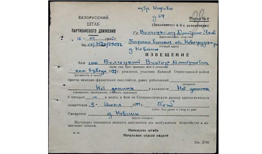 Следователь рассказала, что родился Виктор Дмитриевич Волчецкий в 1922 году в деревне Новины Новогрудского района в крестьянской семье. После воссоединения Западной Беларуси в 1939 году уехал на Донбасс, где работал на шахте. В 1941 году, когда началась война, 19-летний Виктор приехал в отпуск к родителям.
