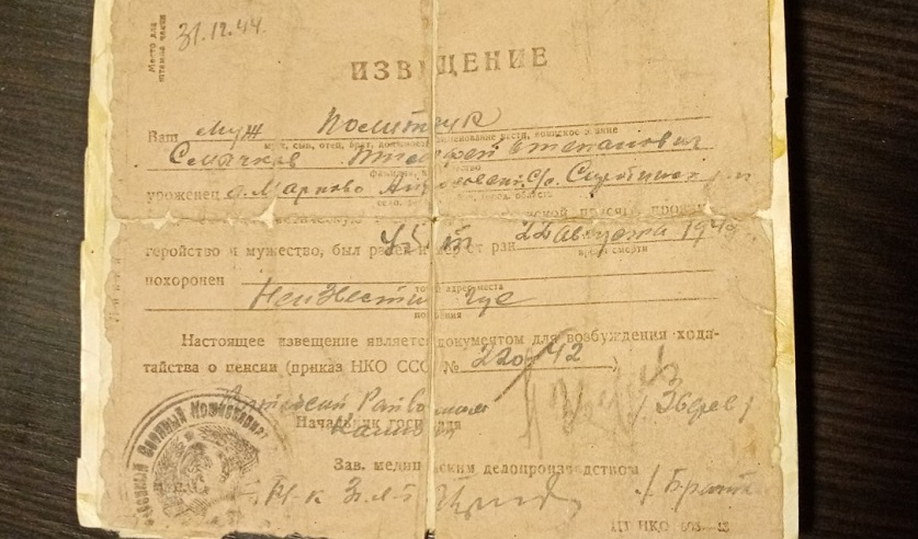 На малой родине остались жена и две дочери. Встретиться им больше не довелось. Писем и сообщений с фронта домой не поступало. Вместо них пришла похоронка: «Смычков Т.С. был убит 22 августа 1942 года». В графе «похоронен» размашистым почерком – «неизвестно где». У прабабушки Матрёны не было возможности заниматься поисками могилы мужа: в послевоенные годы она ставила на ноги своих детей и двоих племянников, оставшихся без родителей. Пожелтевшая, потрёпанная от времени похоронка, позже приклеенная к поздравительной открытке ко Дню Великой Победы, стала нашей семейной реликвией.