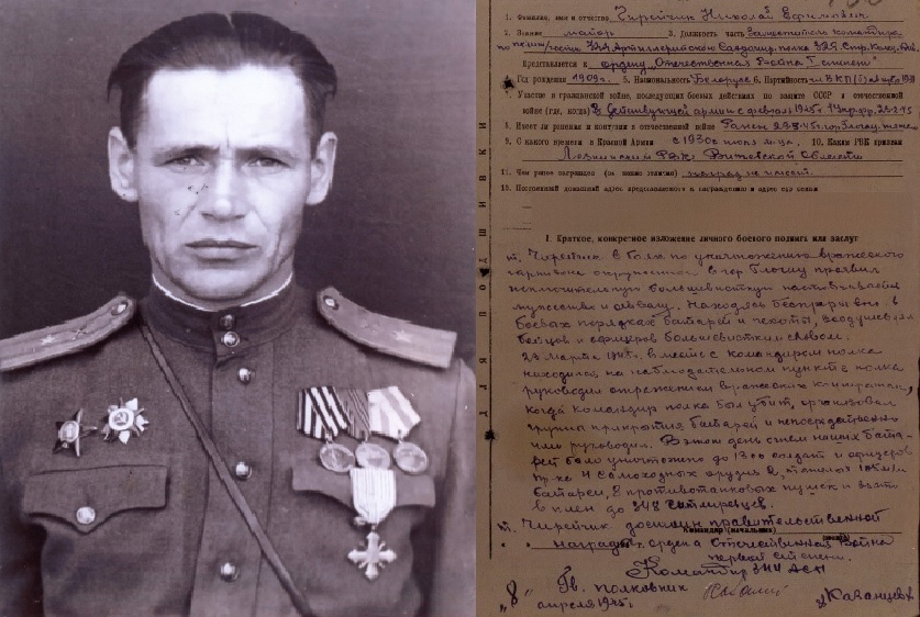«Мой дед, Чирейчик Николай Ефимович, родился в 1909 году в деревне Дубролево Осиповичского района. С октября 1930 года призван на службу в 344 артиллерийский полк 329 стрелковой дивизии.