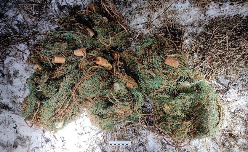 улов и орудия преступления, среди которых лодка и рыболовные сети.