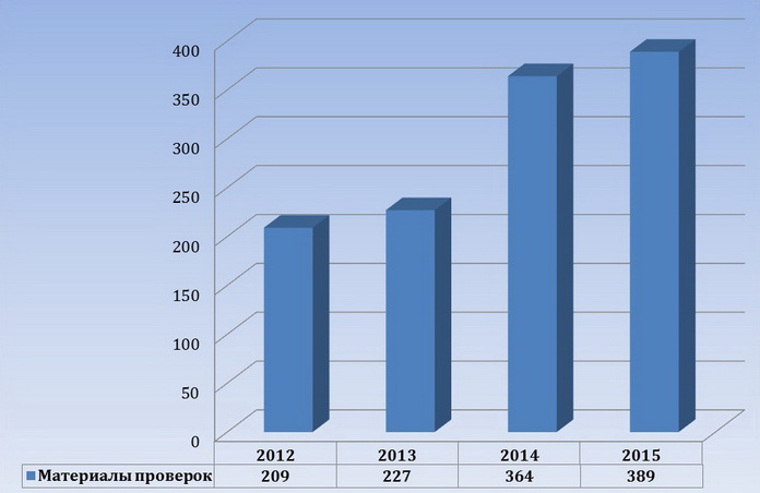 Анализируя аналогичные периоды времени минувших лет, необходимо отметить, что количество поступающих в следственные подразделения материалов проверок указанной категории ежегодно неуклонно растет (2012 год – 209; 2013 год – 227; 2014 год – 364; 2015 год – 389).