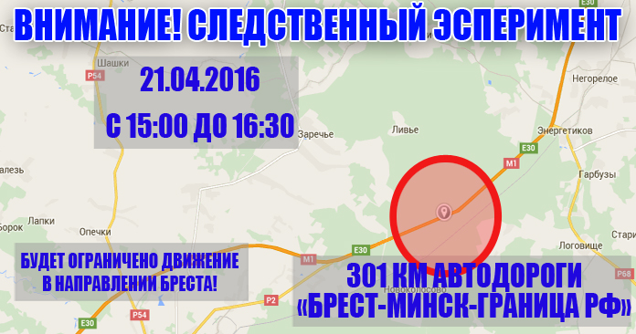 Завтра, 21 апреля 2016 года, на 301 километре автодороги «Брест-Минск-граница РФ», вблизи д.Ливье Дзержинского района...