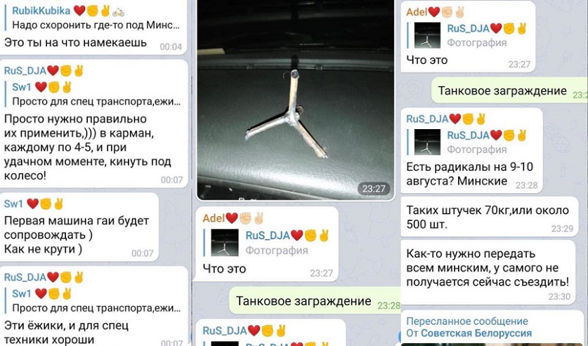 Кроме того, следователями установлено, что этот мужчина являлся администратором одного из каналов деструктивной направленности в мессенджере Telegram, а также участником радикального чата, где искал человека, который сможет доставить «ежи» в Минск. Для этого обвиняемый опубликовал в одном из чатов фотографию металлической конструкции, а также разместил инструкцию по их применению и информацию о поражающих свойствах.