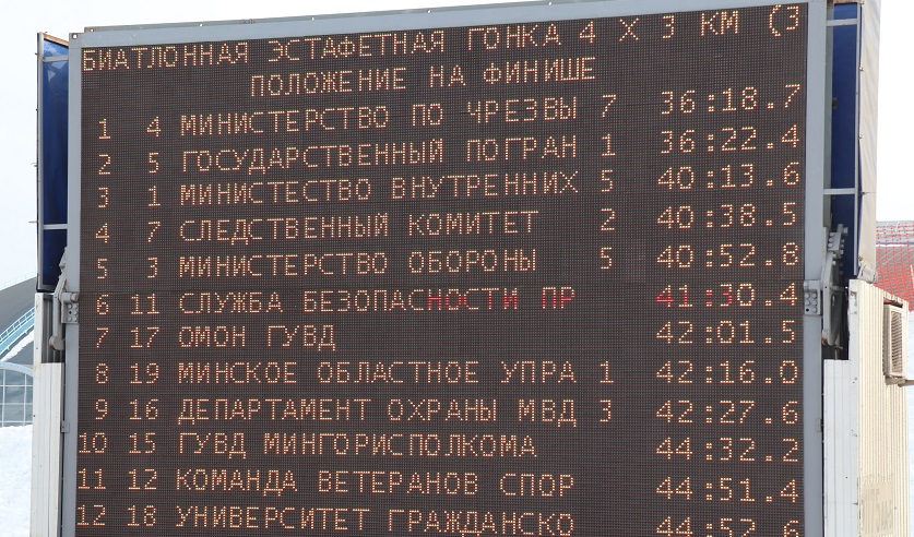 Развивались события на празднике стремительно – спустя каких-то тридцать с небольшим минут после начала биатлонной эстафеты 4 х 3 км первой финишировала команда Главы государства, опередив 19 команд – в том числе, Администрации Президента, Совета Министров и облисполкомов.