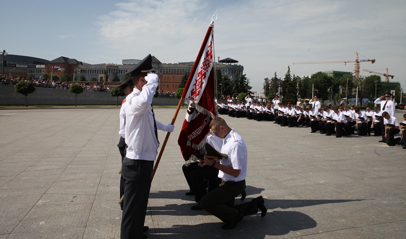 Торжественный ритуал сопровождался выносом Знамени Академии МВД, с которым по традиции простились выпускники.