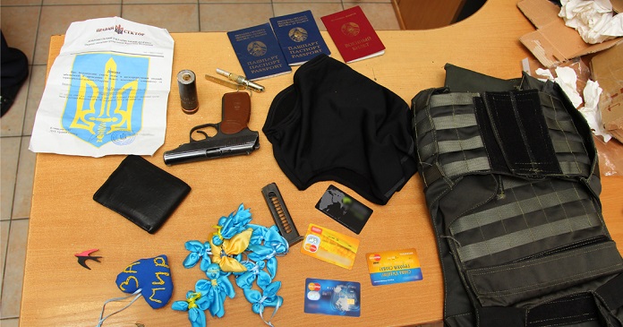 Мужчина был задержан благодаря бдительности сотрудников транспортной милиции. При личном обыске у него были обнаружены: маска с прорезями для глаз, два паспорта, самодельное взрывное устройство на основе осколочной гранаты к станковому гранатомету, пистолет, электронные носители, справка об участии в антитеррористической операции на территории Украины. Кроме того, в момент задержания на теле подозреваемого был надет армейский бронежилет.