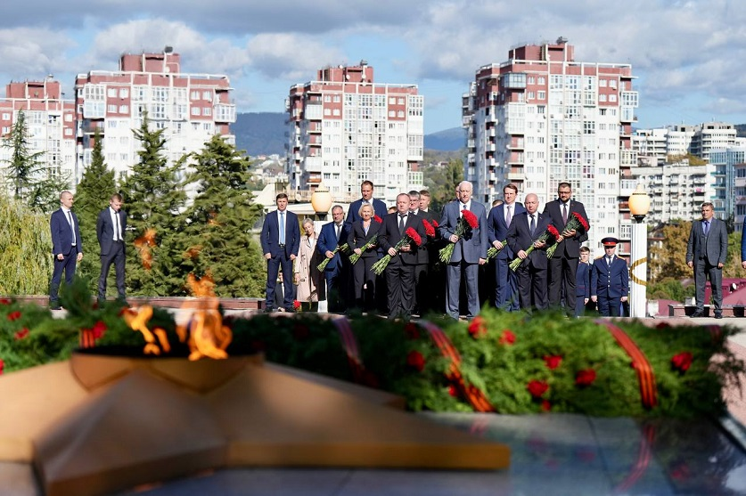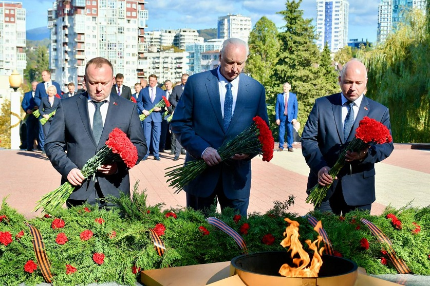 В завершение мероприятия участники совместного заседания в сопровождении Почетного караула торжественно возложили цветы к Вечному огню и Аллее маршалов Завокзального мемориального комплекса – памятника погибшим в годы Великой Отечественной войны 1941-1945 гг.