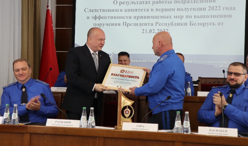 Кроме того, Заместитель Государственного секретаря Совета Безопасности отметил вклад Следственного комитета при организации I-й Международной выставки индустрии безопасности «Национальная безопасность. Беларусь-2022» и от имени организационного комитета вручил главе ведомства памятный знак и благодарность за активное содействие.