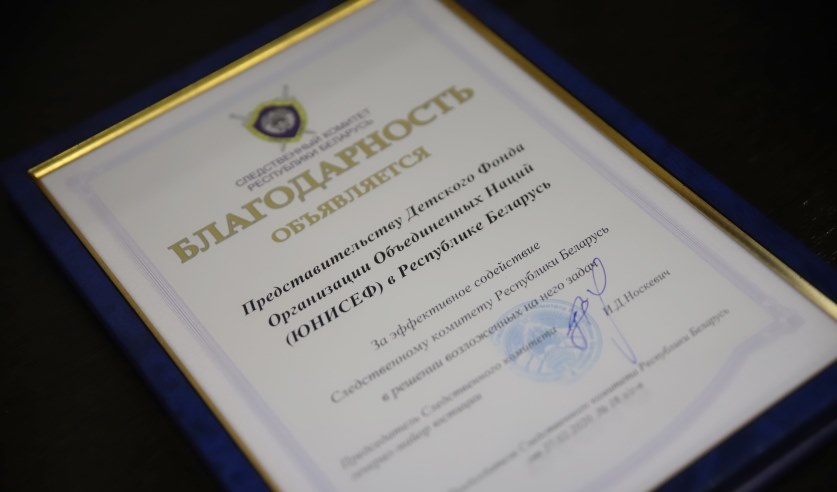 По результатам рабочей встречи сторонами отмечен высокий уровень взаимодействия. В подтверждение этих слов Иван Носкевич вручил Представителю ЮНИСЕФ в Республике Беларусь Рашеду Мустафе Сарвару Почетную грамоту Следственного комитета за значительный личный вклад в налаживание двусторонних отношений Следственного комитета и ЮНИСЕФ.