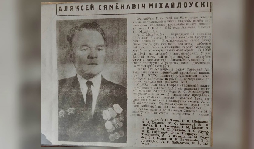 Мой дед Алексей Семенович Михайловский родился в 1917 году в селе Кията Буинского района Татарской АССР. Начинал службу в Тираспольском погранотряде. В 1942 году старший сержант Михайловский зачислен в отряд специального назначения, действовавший в лесах Минской области. Командовал им подполковник госбезопасности Градов, именно под этим псевдонимом скрывался знаменитый разведчик Станислав Ваупшасов.