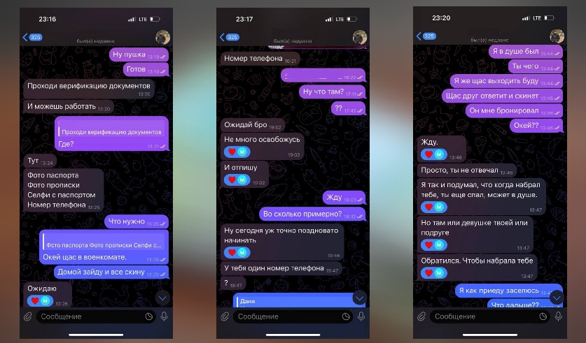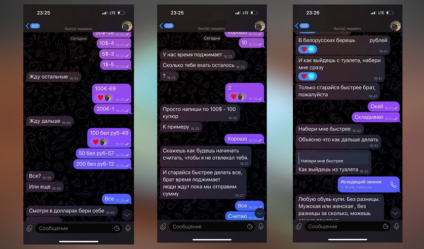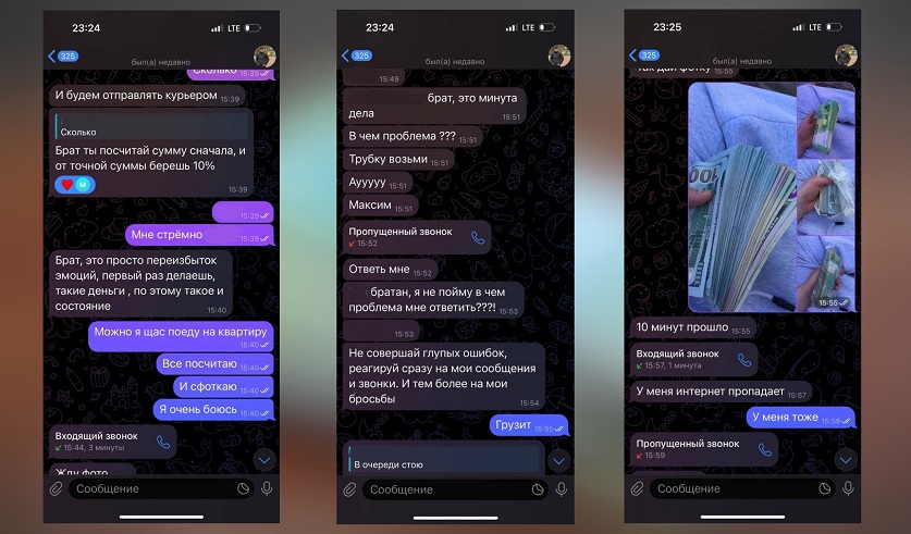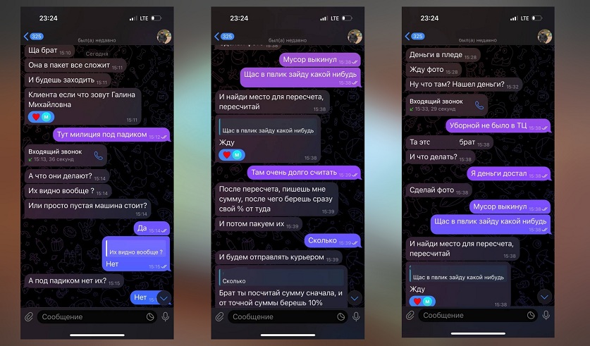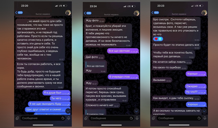 Первый рабочий день наступил только 15 апреля, когда посыльный получил конкретный адрес. Перед поездкой в Центральный район курьера строго проинструктировали: необходимо представиться чужим именем, не задавая вопросов забрать пакет, спрятаться в укромном месте для пересчета денег и самое главное о каждом действии информировать куратора. Незнакомец из мессенджера попросил сделать подчиненного фото с паспортом и пригрозил юноше расправой в случае, если он вдруг решит отойти от алгоритма или забрать посылку себе.