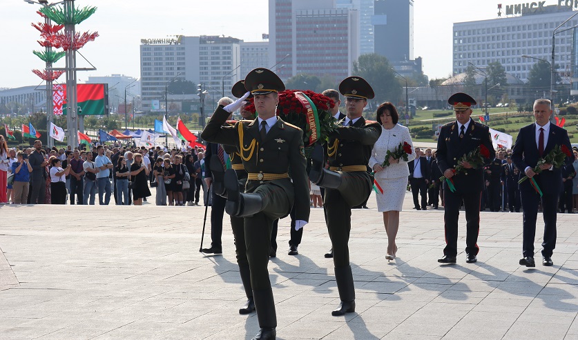 Председатель Совета Республики Наталья Кочанова, министр внутренних дел Иван Кубраков, председатель Мингорисполкома Владимир Кухарев, председатель Мингорсовета Артем Цуран, представители политических партий, общественных организаций и трудовых коллективов пришли к обелиску, чтобы почтить память предков минутой молчания за величайший подвиг, героизм и доблесть.