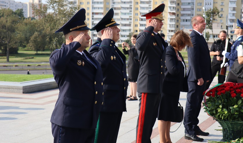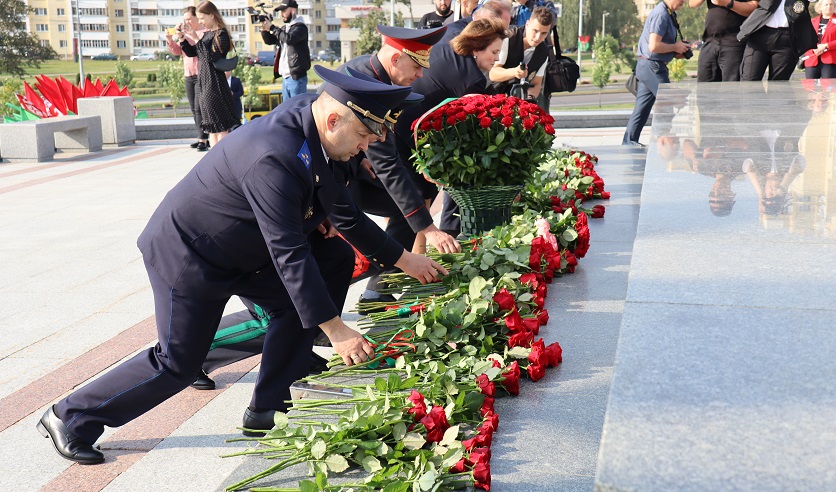Делегация в составе руководства правоохранительных органов столицы и начальника УСК по городу Минску Евгения Архиреева возложила цветы к стеле, воздав славу героям, победившим гнет немецко-фашистских захватчиков.