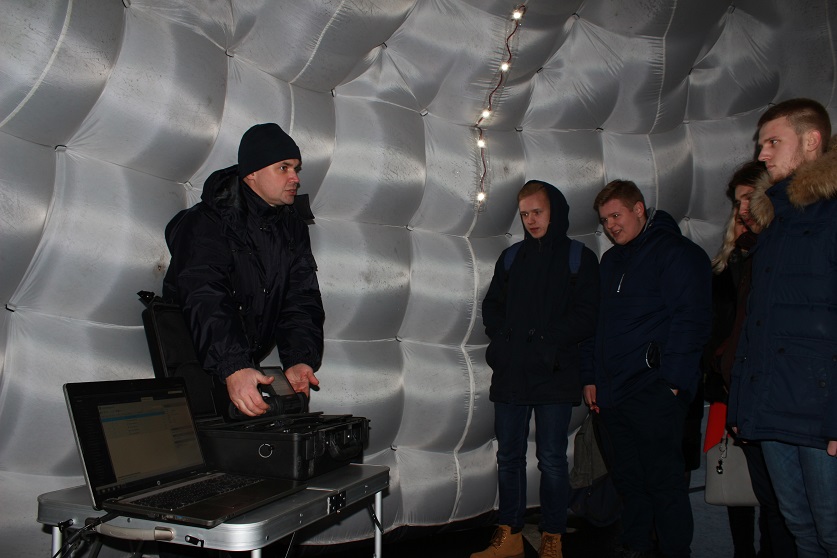 Познакомиться с практической деятельностью следователей ребята смогли в ходе ознакомительной экскурсии. Для них сотрудники криминалистического отдела развернули шатер-палатку, используемый во время выбытий на особо тяжкие преступления на открытой местности в негативные погодные условия. Там они продемонстрировали функции программно-аппаратного комплекса по извлечению информации с мобильных устройств.