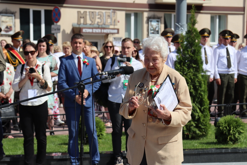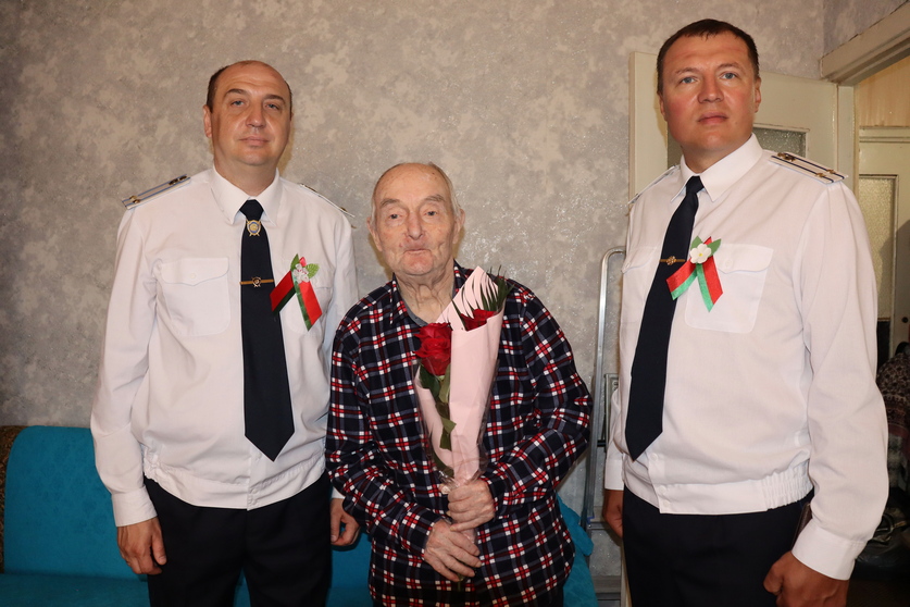 После официальных мероприятий сотрудники управления по сложившейся традиции поздравили с государственным праздником ветерана Великой Отечественной войны Владимира Шкабарина. Офицеры поблагодарили участника партизанского движения за вклад в мирную жизнь граждан свободной Беларуси.