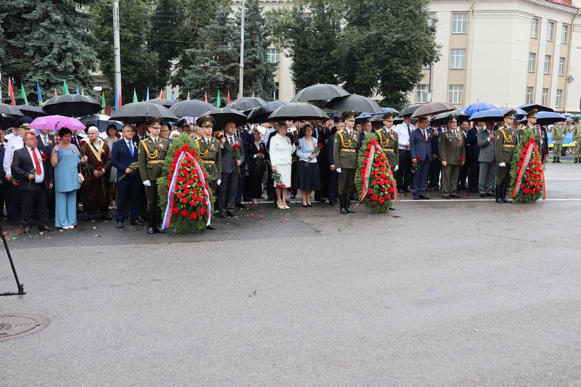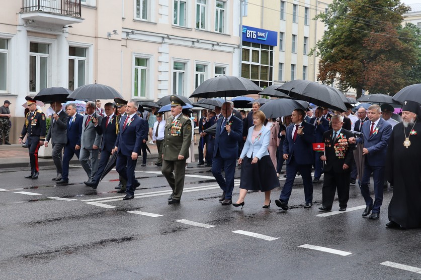 Участники шествия отдали дань памяти героям-освободителям на митинге у мемориального комплекса «Вечный огонь», расположенного на месте захоронения погибших воинов, партизан, подпольщиков. Со знаменательной датой в истории белорусской государственности патриотов поздравили председатель Гомельского облисполкома Иван Крупко, губернатор Кировской области Александр Соколов, участница Великой Отечественной войны Аэлита Самсонова. Павших в боях за освобождение Родины почтили минутой молчания. К монументу возложили венки и цветы.