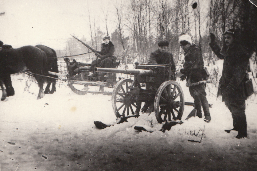 Дмитрий Удовиков руководит партизанской артиллерией (трофейная пушка)