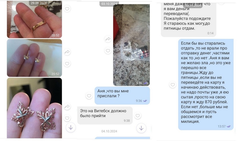 Граждане переводили деньги на банковскую карту фигурантки и, в большинстве случаев, получали посылку с дешевыми использованными вещами: бижутерией, косметикой, детской одеждой, предметами быта. При дальнейшем общении женщина заверяла, что перепутала посылки, и обещала разобраться. При этом придумывала отговорки и тянула время. Некоторым покупателям изначально ничего не отправлялось.