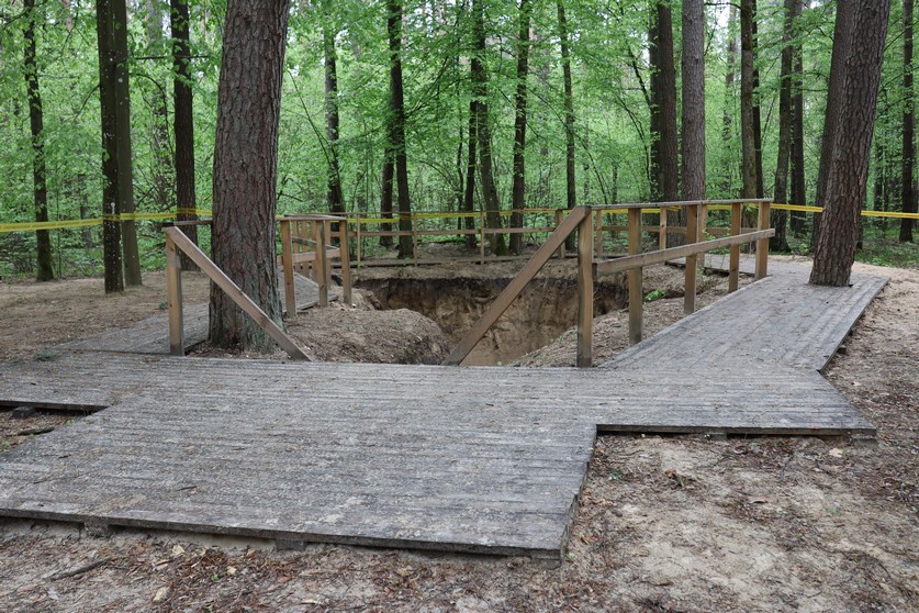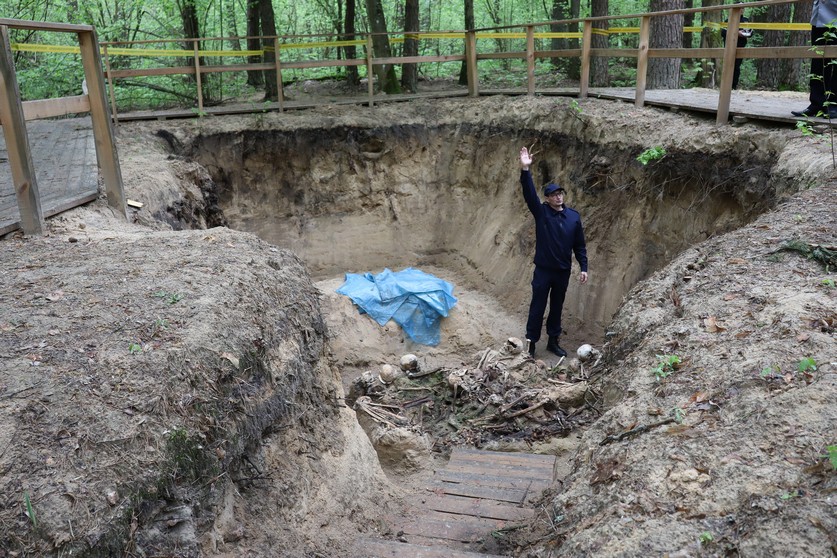 В преддверии Дня Победы в ходе официального визита в Беларусь сотрудники следственного управления СК России по Брянской области посетили знаковый исторический объект в Ченковском лесу – место массовых расстрелов мирного населения фашистскими карателями. Заместитель прокурора Гомельского района Александр Шинкарев возле одной из расстрельных ям с костными останками рассказал о расследовании Генеральной прокуратурой уголовного дела о геноциде белорусского народа в годы Великой Отечественной войны.